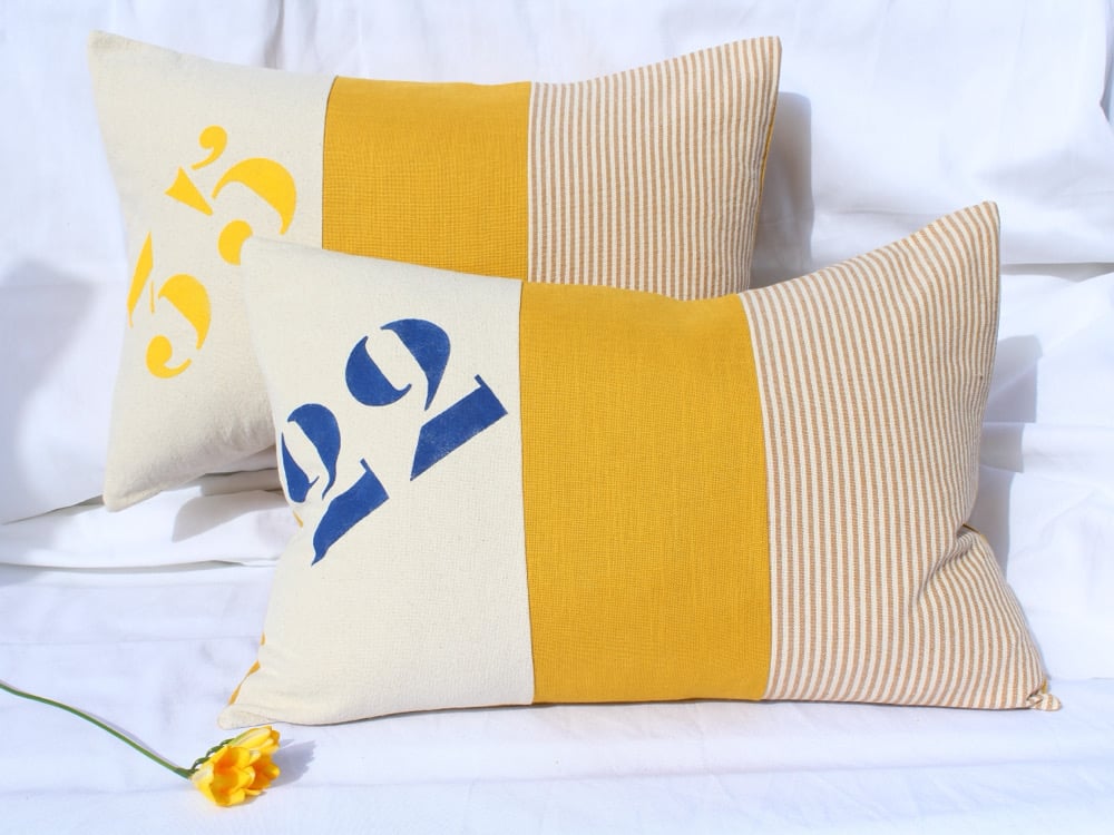 Confectionné en tissu de marinière et lin blanc sur lequel est peint un numéro façon immatriculation de bateau, il est associé à une toile de coton bleue ou rouge. Cet élégant coussin apportera une ambiance marine moderne et originale. Il est également incroyablement confortable grâce à son rembourrage en plumes. Le dos du coussin est également en toile de coton, il est déhoussable pour faciliter le lavage et l’entretien .