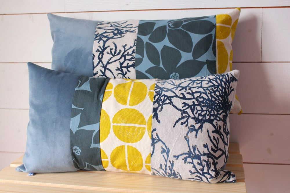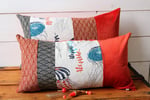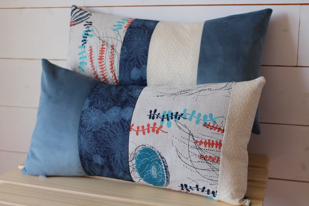 Petit coussin rectangulaire en velours ras et cotons imprimés, déhoussable.